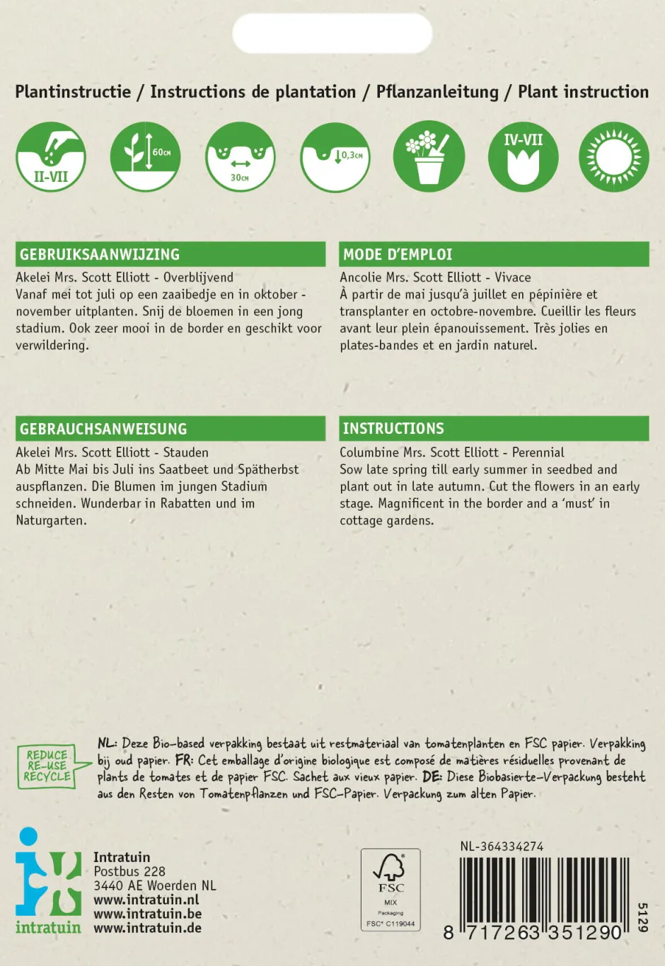 Akelei ‚Mrs. Scott Elliot‘ ist eine Sorte mit gemischten Blütenfarben in Gelb- und Rottönen. Die Blüten blühen im Frühling und sind zweifarbig. Sie sind mehrjährig und blühen nicht im ersten Jahr. Die Blätter sind blaugrün und bilden eine Rosette, über der die Blüten an kräftigen Stängeln wachsen. Sie mögen hellen Schatten und feuchten Boden, obwohl sie auch andere Bedingungen vertragen.