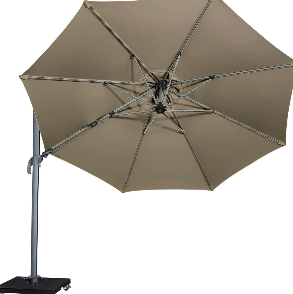 Dieser Ampelschirm wird ohne Ständer geliefert. Kombiniere den Schirm mit dem passenden ‚Kreuzfuß-Sonnenschirmständer Merida Stahl anthrazit‘.