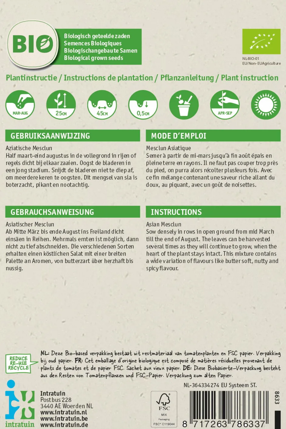 Diese Mischung verschiedener Schnittsalate kann in einem jungen Stadium als ‚Babyleaf‘ geerntet werden. Es handelt sich um würzig schmeckende Sorten wie Paksoi und Blattsenf, sowie Chinakohl, Kohlrabi und Mangold. Die Zusammensetzung kann von Packung zu Packung leicht variieren, aber es sind immer 6 Sorten enthalten. Die Salate können sowohl in der Sonne als auch im Halbschatten wachsen.