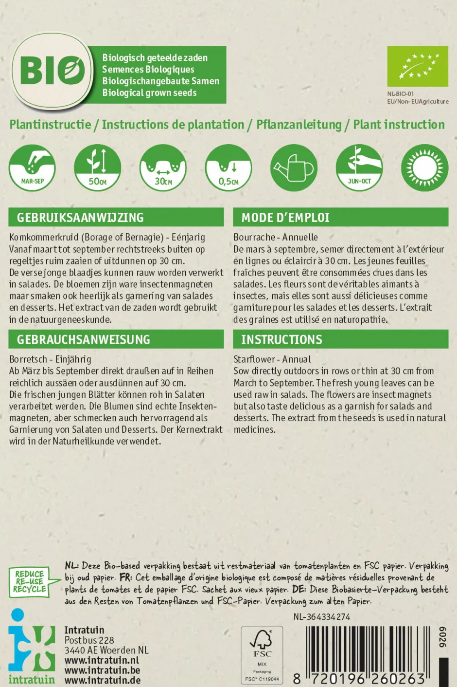 Dieser Borretsch wird auch Gurkengewürz genannt. Das erklärt sich nur wegen des Geruchs und Geschmacks, der an Gurken erinnert, denn ansonsten ist es eine ganz andere Pflanze. Der Gurken-Borretsch ist eine einjährige Pflanze, die oft spontan wieder auftaucht, da sie sich leicht selbst aussät. Die gesamte Pflanze ist zart behaart und blüht den ganzen Sommer über. Die kobaltblauen Blüten sind essbar und eignen sich zur Dekoration von Salaten. Der Rest der Pflanze kann roh sehr fein gehackt in Salate gegeben werden, kann aber auch scharf wie Spinat oder in einem Frühlingseintopf gegessen werden. Die Pflanzen enthalten viele wichtige Mineralien wie Kalium und Kalzium, was sie zu einer gesunden und schmackhaften Ergänzung macht.
