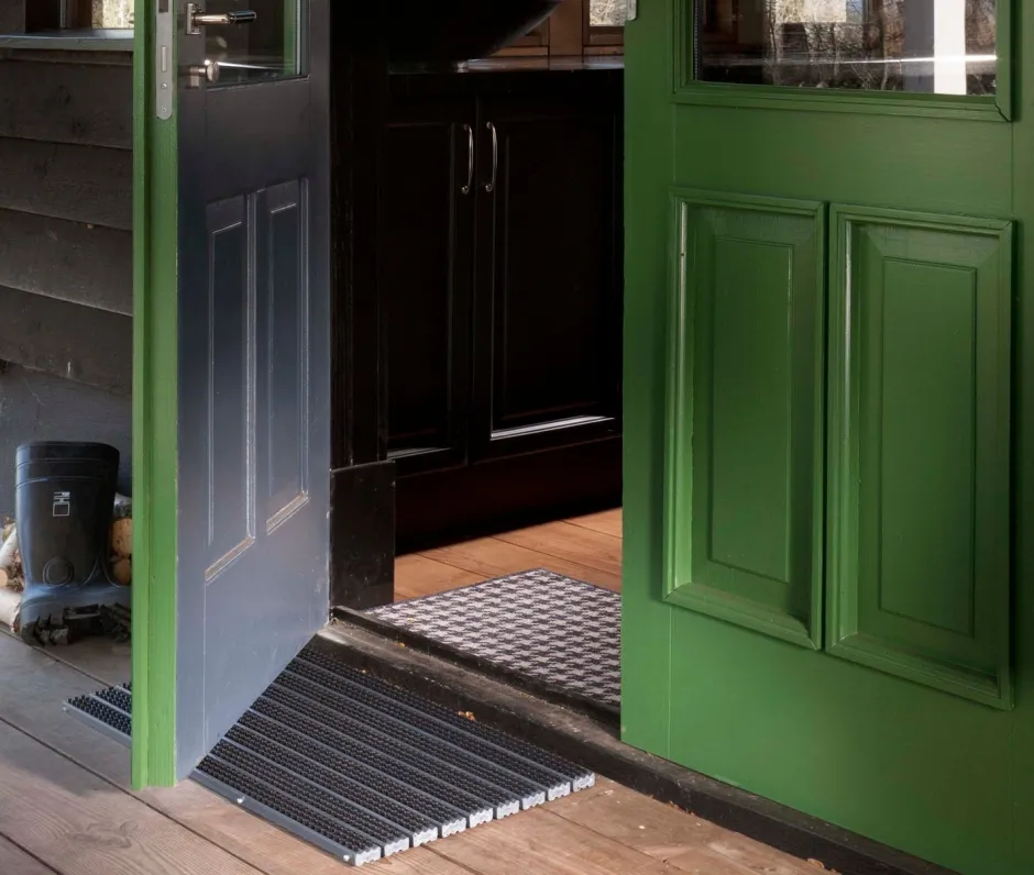 Reinige die Bürstenmatte mit einem Besen und entferne hartnäckigen Schmutz bei Bedarf mit einem Gartenschlauch.