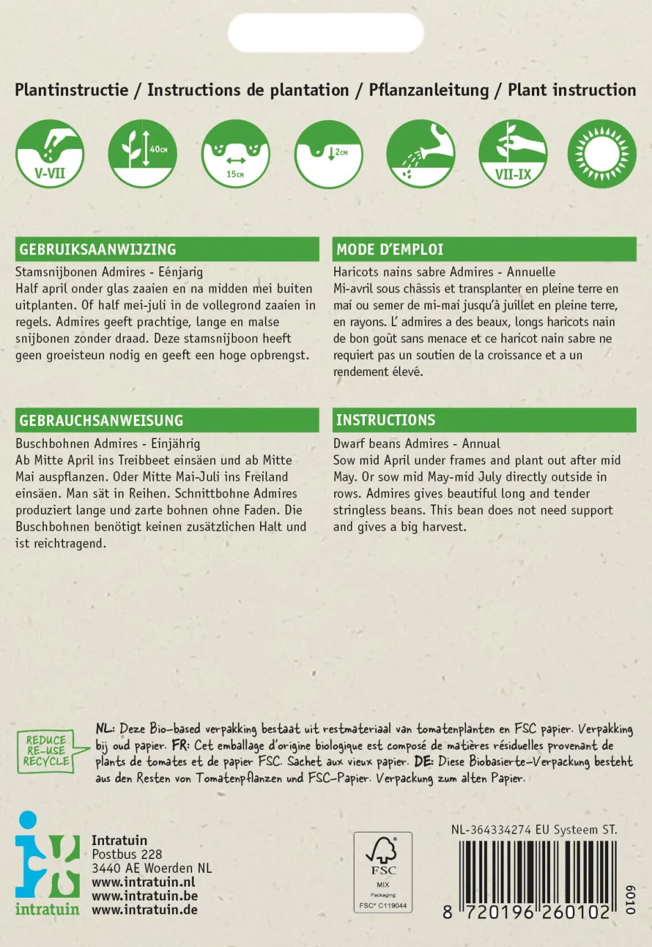 Die Admires ist eine verbesserte Buschbohnenvariante mit einem hohen Ertrag und schöner Farbe. Sie kann früh geerntet werden, ist gut krankheitsresistent und hat einen feinen Geschmack. Die Bohnen sind gerade und flach und wachsen in Büscheln. Die Bohnen sind etwa 20 cm lang und wachsen niedrig am Boden.