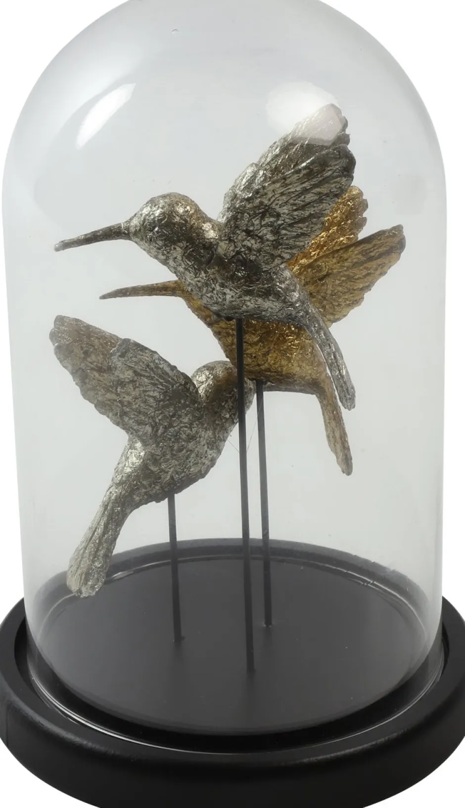 Mit dieser stilvollen Dekoration aus der Countryfield-Kollektion kannst du dein Zuhause ganz persönlich gestalten. Diese Glasglocke steht auf einem schwarzen Sockel. Auf diesem Plateau sind drei Kolibris in einer goldenen Farbe angebracht. Das gibt der Glocke eine extra schöne Ausstrahlung. Der Durchmesser dieses Artikels beträgt 14 cm bei einer Höhe von 22 cm.