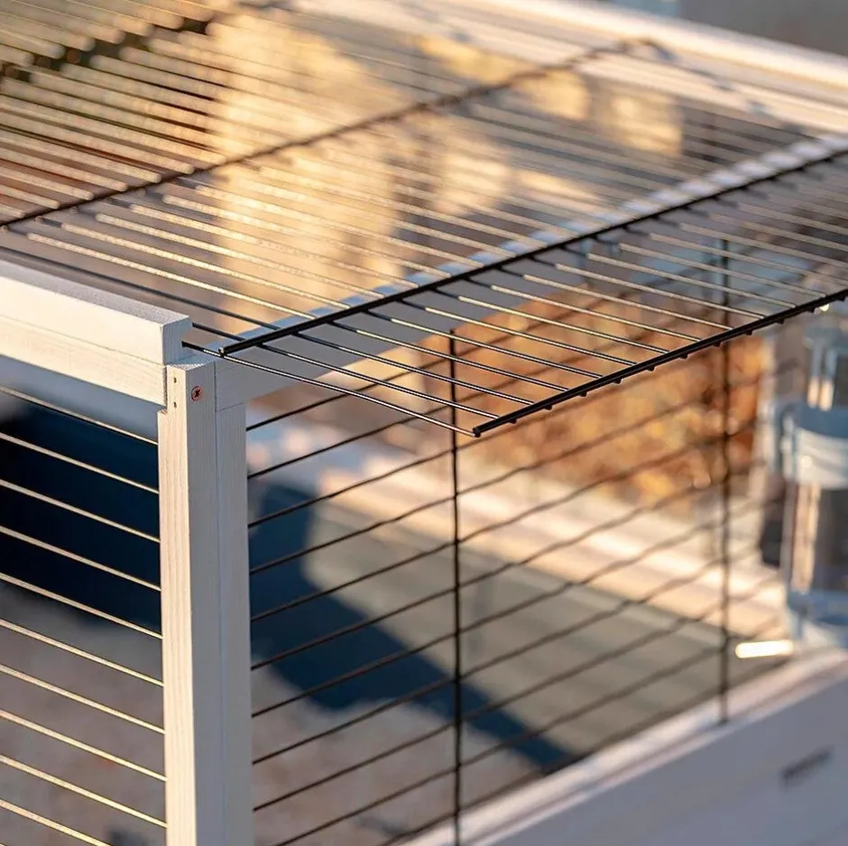 Die Besonderheit dieses Stalls besteht in der angenehmen Materialkombination von Holz und Drahtgeflecht. Es wird FSC™ zertifiziertes Holz verwendet, das heißt es stammt aus Wäldern, die gemäß strengen Umwelt-, Sozial- und Wirtschaftsstandards verantwortungsbewusst bewirtschaftet werden. Das Holz wird durch einen ökologisch ungiftigen und schimmelhemmenden Lack geschützt, der es gegen UV-Strahlen beständig macht und wasserabweisend wirkt. Dieser wird mittels Fließbeschichtungstechnologie aufgetragen und ermöglicht eine ausgezeichnete Haltbarkeit des Produkts über lange Zeit.