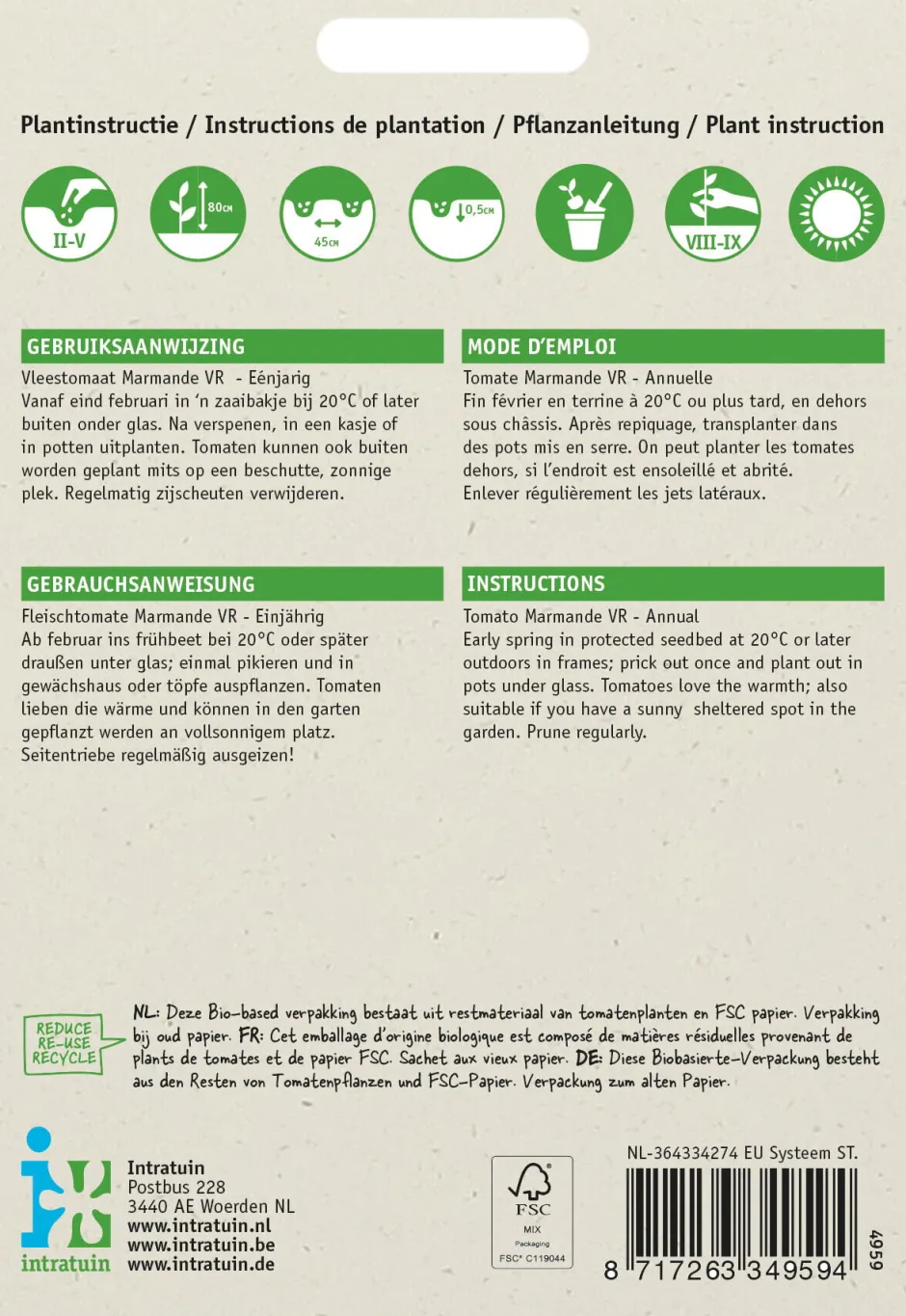 Bei der Tomatensorte ‚Marmande‘ handelt es sich um eine französische Sorte, die eine große Menge an leicht abgeflachten, roten Fleischtomaten hervorbringt. Die Früchte sind groß und haben einen guten Geschmack. Die Tomatenpflanzen werden 200 cm hoch und müssen aufgrund des hohen Gewichts der Früchte an Stangen oder Stäben gestützt und angebunden werden. Die Aussaat der Tomatensamen erfolgt ab Anfang März in einer Saatschale oder in Anzuchttöpfen bei Zimmertemperatur (ca. 20° C). Nach dem Pikieren im April wachsen die Tomatenpflanzen zu kräftigen Pflanzen heran und können dann im Gewächshaus oder draußen in Töpfen ausgepflanzt werden. Warte mit dem Auspflanzen bis nach Mitte Mai und gewöhne die Pflanzen schrittweise an die niedrigeren Temperaturen. Die Sorte ‚Marmande‘ ist auch für die Freilandkultur an einem sonnigen, geschützten Platz geeignet. Die behaarten Stängel der Tomatenpflanzen sind anfällig für Schimmel und sollten daher möglichst trocken gehalten werden. Aus diesem Grund werden Tomaten oft unter einem möglichst lichtdurchlässigen Vordach angebaut.