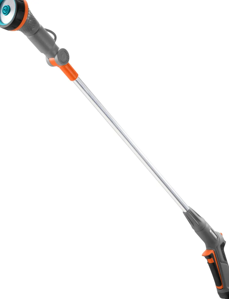 Der Blumenampel-Gießstab hat eine Länge von 90 Zentimetern. Der Brausegrad lässt sich um 200° schwenken. Der ergonomische Handgriff mit Weichkunststoffelementen liegt besonders gut in der Hand. Die Auslösetaste mit integrierter Dauerarretierung und die stufenlose Regulierung der Wassermenge mit nur einem Finger machen die Handhabung besonders angenehm.