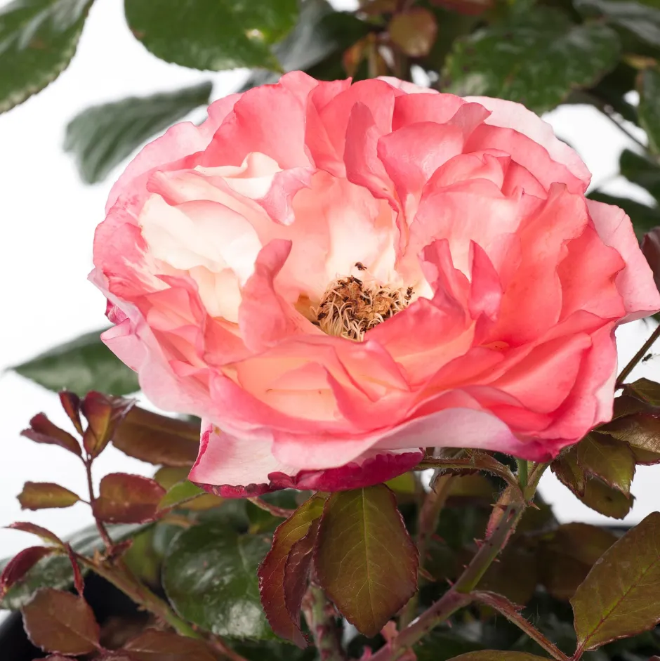 Diese großblütige Strauchrose bringt wunderschöne Blüten hervor, die eine tolle rot-weiße Farbkombination haben. Sie ist eine kräftige Pflanze und die Blätter sind anfangs rot und werden dann leuchtend grün. Die Stängel sind sehr robust. Die Pflanze wird etwa 80 cm hoch und ist krankheitsresistent und auch für einen Topf geeignet. Die Blüten sind auch in einer Vase schön.