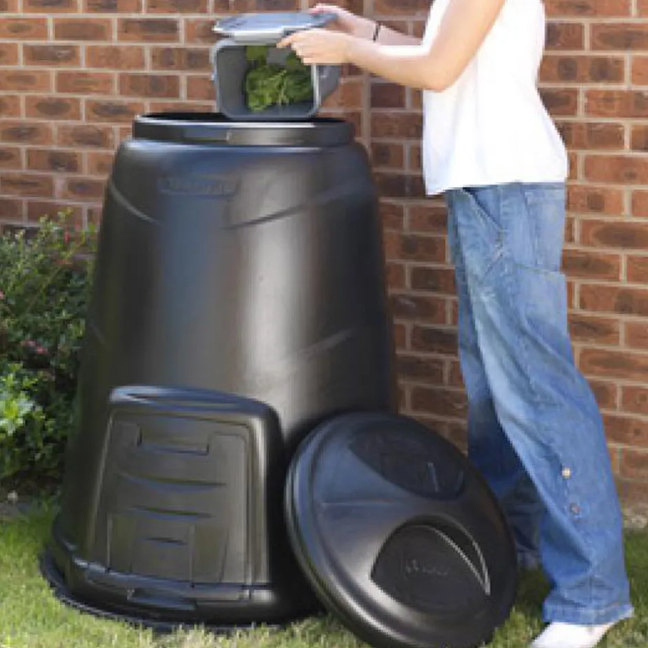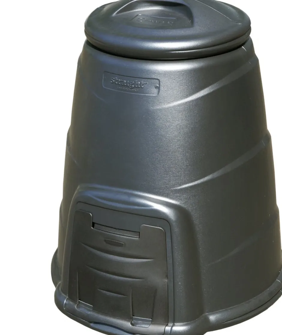 Diese Komposttonne ist schwarz, besteht aus Kunststoff und hat ein Fassungsvermögen von sage und schreibe 220 Litern. Sie hat einen Durchmesser von 74 cm und eine Höhe von 90 cm.