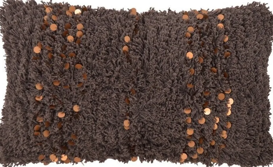 Das längliche Kissen Boston hat eine warme braune Farbe. Zwischen den weichen Fransen des Kissens sind farblich passende große Pailetten zu finden, die für einen spielerischen Effekt sorgen.