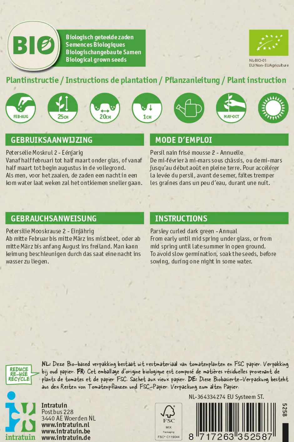 | Besonderheiten | Du kannst regelmäßig Stängel von der Petersilie ernten; solange das Herz intakt bleibt, wird die Petersilie neue Stängel bilden. Dieses biologisch angebaute Saatgut ist von der Stiftung SKAL zertifiziert. Du erkennst biologische Produkte an dem Bio-Siegel |