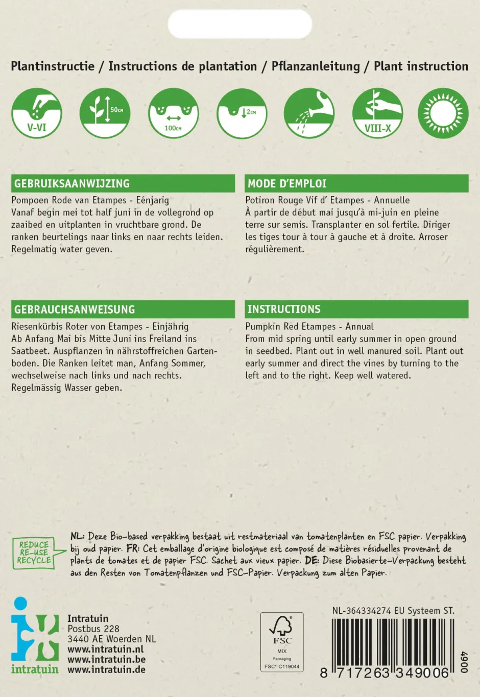 Dieser flach-runde, orangefarbene Kürbis wird in Frankreich häufig gegessen. Diese Sorte ist für den Anbau im Freiland geeignet. Der Ertrag ist hoch und die Früchte wachsen an Ranken, die regelmäßig gekürzt werden können. Von April bis Mai kannst du sie im Haus oder im Gewächshaus aussäen, in Töpfe umpflanzen bei entsprechender Größe und Mitte Mai nach draußen verpflanzen. Du kannst sie auch Mitte Mai bis Juni im Freien in ein Saatbeet oder in Töpfe säen. Im Juni kannst du sie in gut gedüngtem Boden an einem geschützten Ort mit 150 cm Abstand zwischen den Pflanzen auspflanzen. Kürbisse mögen einen warmen, sonnigen Platz. Geerntet wird von Juli bis Oktober.