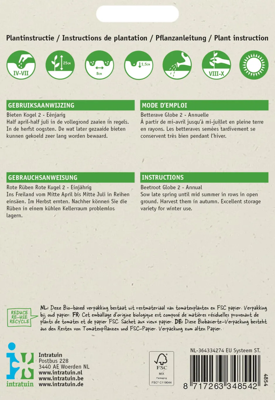 Diese Rote Bete hat einen süßen und saftigen Geschmack. Die Sorte ‚Bullet 2‘ ist für den Sommer- und Herbstanbau geeignet. Rübenpflanzen können nicht verpflanzt werden, also säe sie direkt im Garten aus. Der Anbau im Gewächshaus ist ebenfalls möglich, in diesem Fall solltest du im Februar/März säen. Wähle einen Platz in der Sonne oder im Halbschatten. Hast du schweren Lehm in deinem Garten oder ist der Boden ziemlich nass? Dann baue die Rüben in mit grobem Sand verbesserten Hochbeeten an. Die eigentliche Rübe ist eine Wurzelknolle, die unter der Erde wächst.
