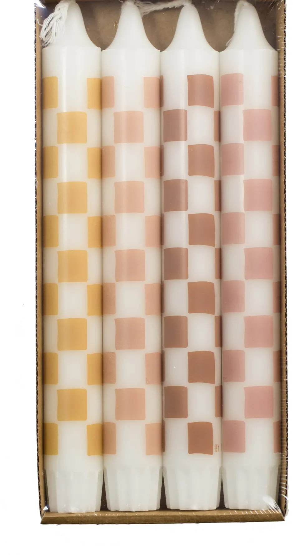 Diese Kerzen sind zu je 4 Stück verpackt und haben eine Brenndauer von 7 Stunden. Die Kerzen haben mehrere Farben und ein Schachbrettmuster. Die Kerze hat einen Durchmesser von 2,2 cm und eine Höhe von 20 cm.