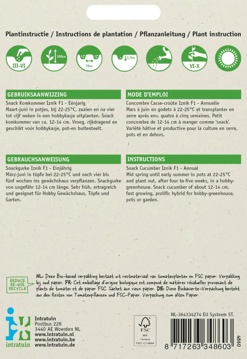 Die Gurkensorte ‚Iznik F1‘ ist eine zuverlässige Sorte, die kleine, dunkelgrüne Gurken hervorbringt, die mit einer Länge von etwa 10 cm geerntet werden. Mit ihrer dünnen Schale eignet sich diese Gurke prima als ‚Snackgurke‘. Die Gurkenpflanze kann sowohl unter Glas als auch im Freien in einem humusreichen und gut feuchtigkeitsspeichernden Boden angebaut werden. Die Gurkensamen werden ab Mitte März bis Mitte April bei einer Temperatur von 20-25° C ausgesät.Sobald die Pflanzen austreiben, brauchen sie so viel Licht wie möglich, damit die jungen Gurkenpflanzen stark werden und nicht vergeilen. Ab Mitte April können die jungen Gurkenpflanzen in ein (beheiztes) Gewächshaus gefplanzt werden, ab Mitte Mai auch ins Freie. Weil Gurkenpflanzen sehr viel Licht und Wärme benötigen, kannst du sie z.B. gut an eine Südmauer stellen. Auch benötigt die Gurke viel Wasser, denn die Früchte erreichen innerhalb weniger Wochen ein Gewicht von 400 Gramm. Achte also darauf, dass die Erde niemals austrocknet. Die haarigen Blätter und Stängel der Pflanze neigen zur Schimmelbildung. Halte diese soweit es geht trocken.