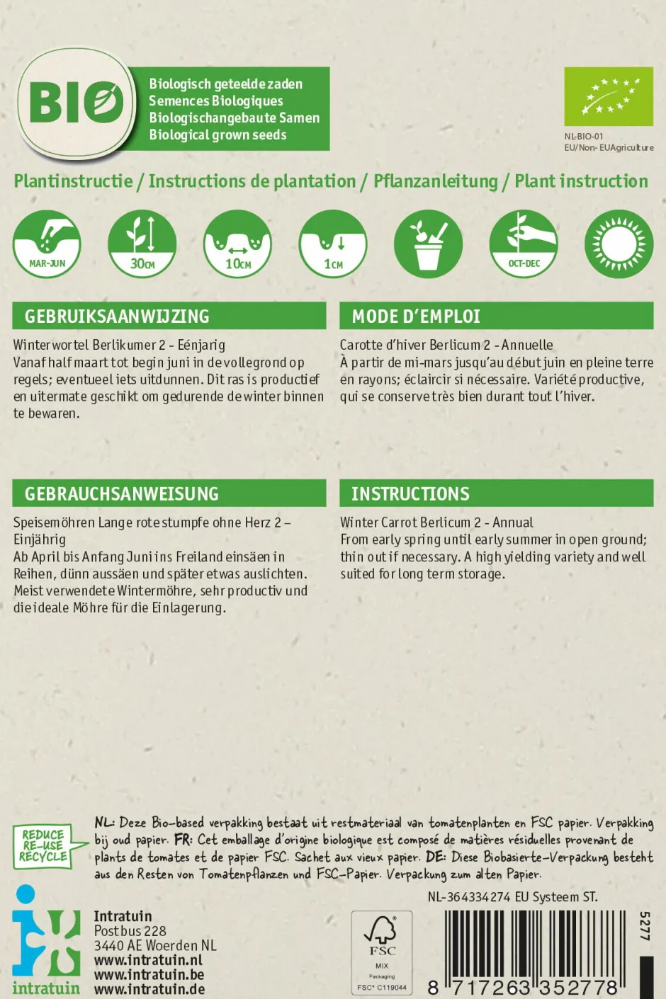 Die Speisemöhre ‚Berlikumer 2‘ schmeckt köstlich süß und kann lange wachsen, was ihren Ertrag erhöht. Die orangefarbenen Wurzeln haben eine feste Struktur und werden etwa 25 cm lang, sie lassen sich gut lagern. Draußen im Garten kann zwischen März und Juni in Reihen mit 20 cm Abstand gesät werden. Dünne nach dem Auflaufen aus, bis der Abstand zwischen den Pflanzen 3 cm beträgt. Je größer der Abstand zwischen den Möhren ist, desto dicker können sie wachsen. Geerntet wird von September bis Dezember.