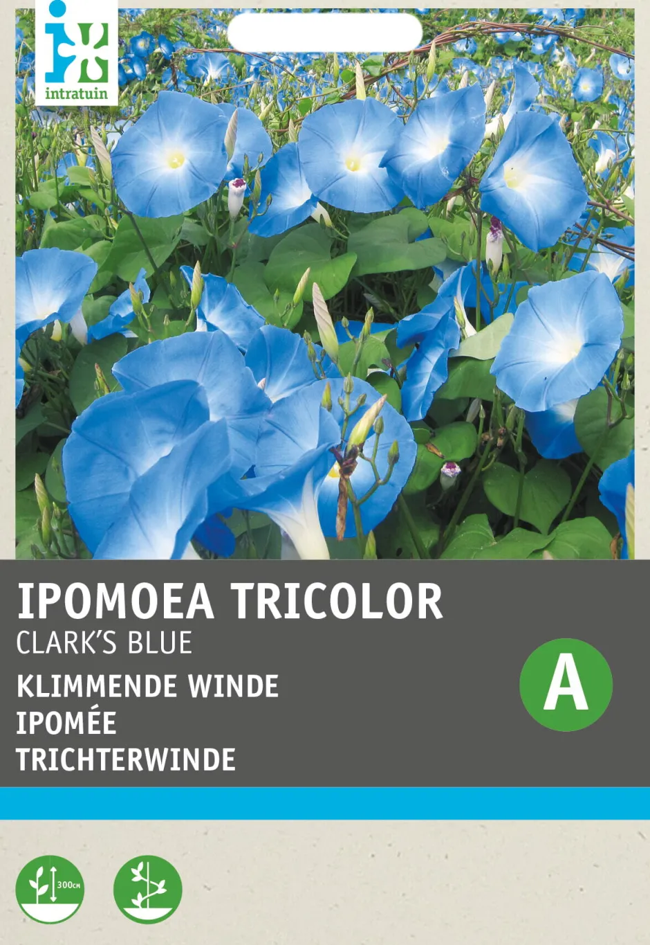 Die Trichterwinde wird in England ‚Morning Glory‘ genannt. Das bezieht sich auf ihre schönen Blüten, die nur morgens in ihrer vollen Pracht blühen. Jede Blume blüht nur einen Morgen, aber da es so viele von ihnen gibt, spielt das keine Rolle. Die Sorte ‚Clark’s Blue‘ bekommt himmelblaue, trompetenförmige Blüten und kann meterhoch klettern. Dazu braucht die Pflanze eine Stütze, um die sich die Ranken winden können, z.B. einen Wigwam aus Stöcken. Die Blätter dieser einjährigen Kletterpflanze sind herzförmig.