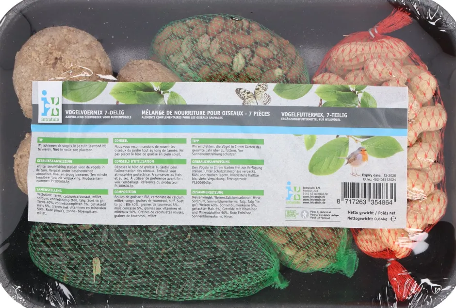 | Inhaltsstuffe | Schwarze Sonnenblumenkerne, rote Erdnüsse, Erdnüsse (geschält), Weizen, Rindertalg, Calciumcarbonat, Weizenmehl, schwarzer Hafer |