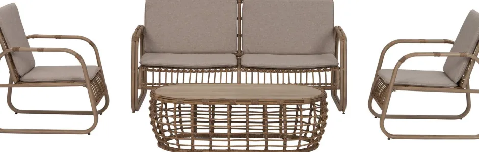 Dieses trendige Lounge-Set Jade aus der Gartenkollektion von Intratuin wird durch seinen schönen Materialmix sicher nicht unbemerkt bleiben. Das Lounge-Set Jade hat einen Aluminiumrahmen und ist handbemalt in der Farbe Teak. Das Gestell ist mit einem Weidengeflecht versehen, das den letzten Schliff gibt. Der Loungetisch hat eine Tischplatte aus Keramikglas. Gemütlich und attraktiv für jeden Garten!