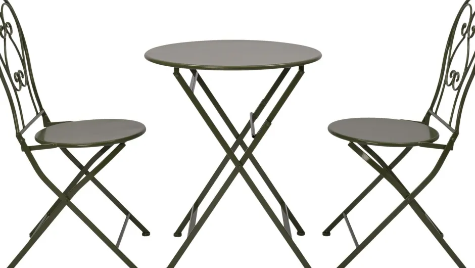Der Gartentisch ist 72 cm hoch und hat einen Durchmesser von 60 cm. Jeder Bistrostuhl misst 38 x 49 x 90 cm.