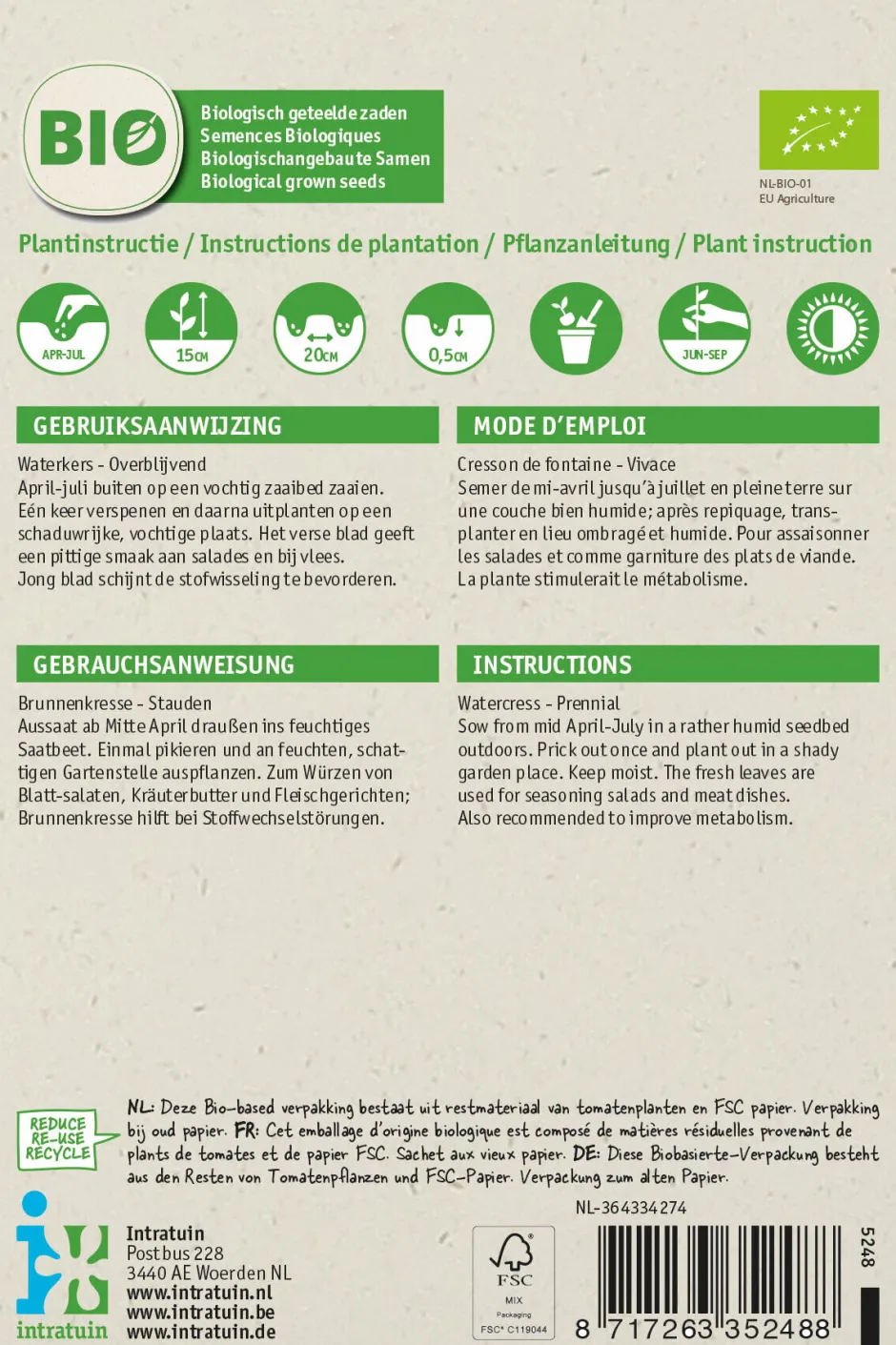 Brunnenkresse kann das ganze Jahr über im Haus in einer Saatschale an einem hellen Standort ausgesät werden. Da jeder Samen keimen wird, ist es ratsam, nur einen kleinen Teil des Tütchens gleichzeitig zu säen. Wenn du in einem Anzuchtkasten mit Deckel säest, achte dann auf ausreichende Belüftung, sodass Schimmel keine Chance hat. Wenn du nur den oberen Teil der Pflanze abschneidest, kann die Pflanze nachwachsen und du kannst über einen längeren Zeitraum Kresse ernten. Tipp: Säe nicht zu dicht nebeneinander, sodass die Kressepflanzen ausreichend Platz haben.