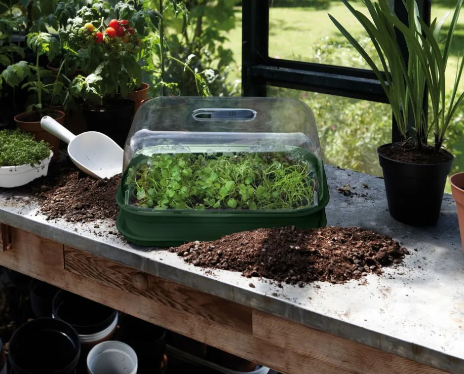Fülle die Schale mit Sand oder kleinen Töpfen und beginne die Anbausaison! Im Handumdrehen kannst du ganz einfach Stecklinge für z. B. Gurken oder Tomaten ziehen oder das Tablett mit Kräutern oder Salat befüllen. Die Anzuchtschale kann im Garten, in der Küche oder auf der Fensterbank aufgestellt werden.