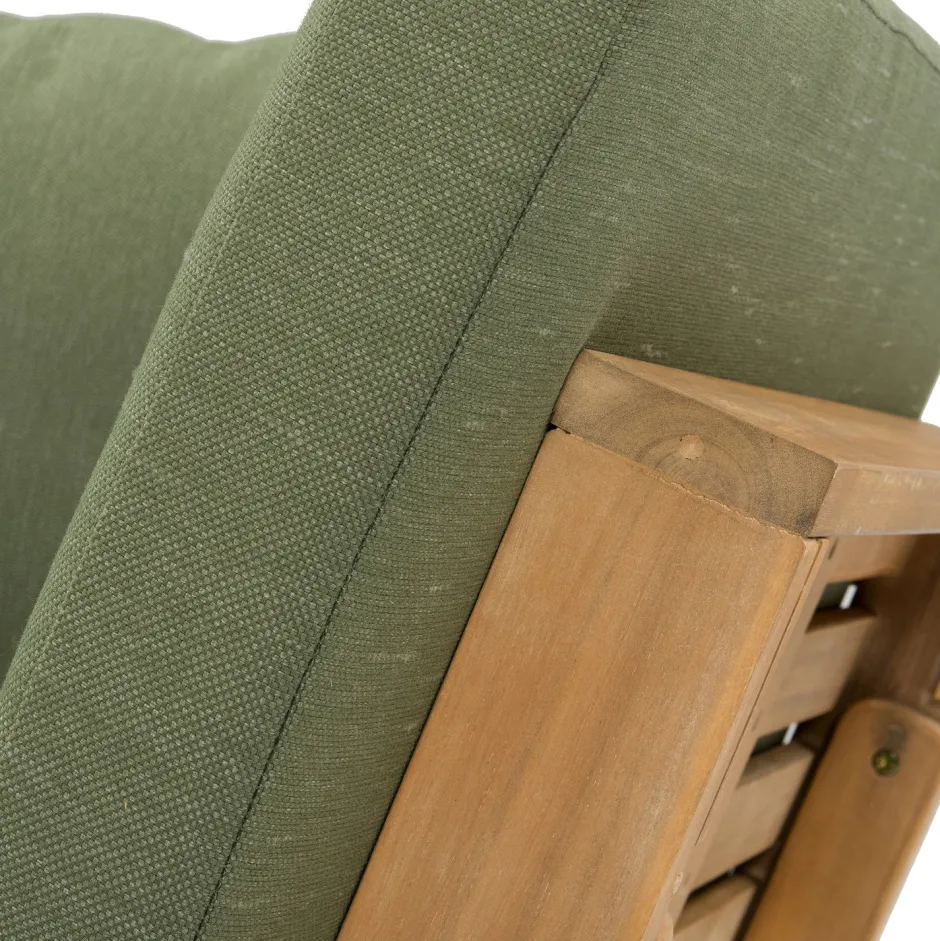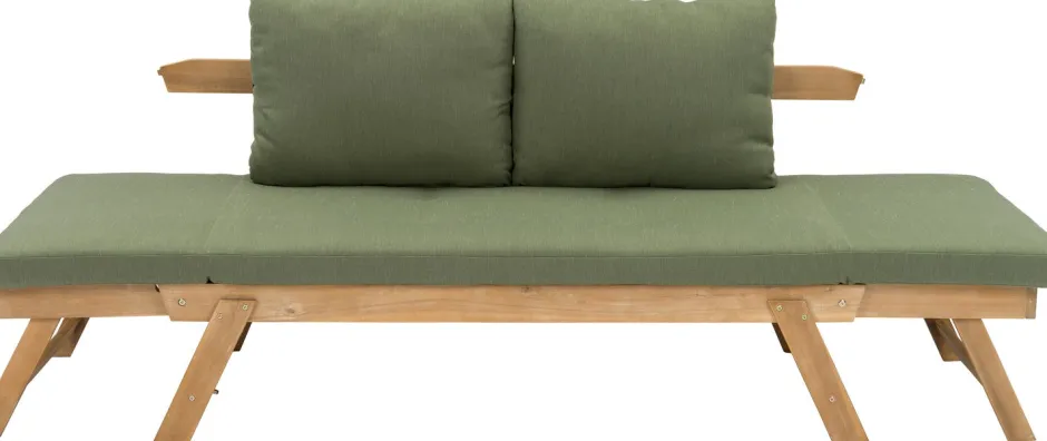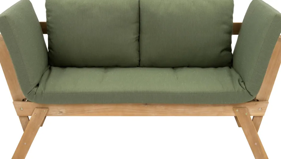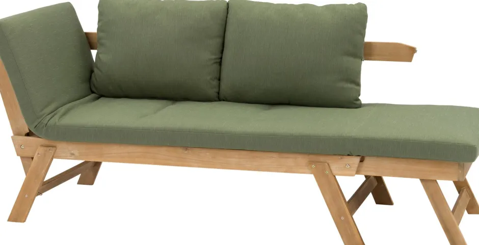 Die Gartenbank ‚Lorient‘ ist aus nachhaltigem Akazienholz gefertigt und hat daher eine schöne, natürliche Ausstrahlung. Die Seitenteile der Bank sind verstellbar, sodass du die Gartenbank einfach in eine bequeme Gartenliege verwandeln kannst. Die im Lieferumfang enthaltenen Sitzkissen haben einen frischen, grünen Farbton, der für botanisches Ambiente sorgt. Die Auflagen sind zudem sehr dick, was für optimalen Sitz- und Liegekomfort sorgt. So wird Entspannen leicht gemacht!