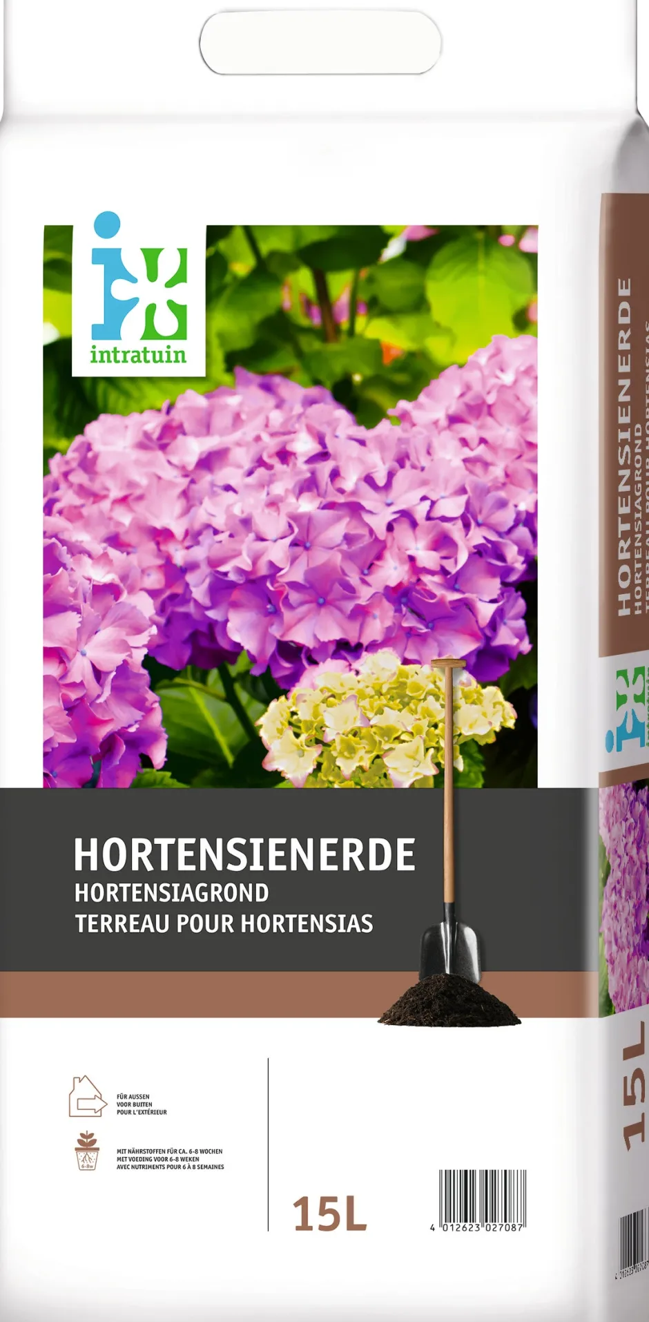 Die Intratuin Hortensienerde ist ein gebrauchsfertiges Kultursubstrat zum Pflanzen und Umtopfen von weißen, rosa und roten Hortensien. Die optimale Torfstruktur sowie der enthaltene Vulkanton garantieren eine sehr gute Wasser- und Luftführung. Die Erde bleibt vergießfest und atmungsaktiv. Das heißt: Das Gießwasser kommt immer genau dort an, wo es benötigt wird! Ausgewogen dosierte Dünger, Spurenelemente und Nährstoffe sowie ein speziell eingestellter pH-Wert stimmen die Intratuin Hortensienerde auf die Bedürfnisse der anspruchsvollen Pflanzen ab. Die Hortensienerde bietet die optimalen Voraussetzungen für ein kräftiges Wachstum und eine beeindruckende Blütenpracht.