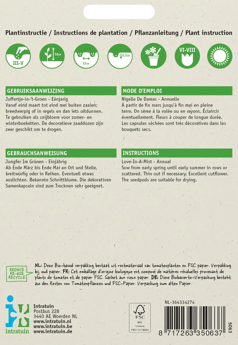 Die Aussaat erfolgt von April bis Ende Mai direkt in der Erde. Sollte es nach der Aussaat längere Zeit nicht regnen, solltest du den Boden mit einer Plastikfolie oder einem Vliestuch abdecken, um das Austrocknen des Bodens zu verhindern. Was den Boden anbelangt, ist jeder Boden recht. Allerdings bevorzugt die Jungfer im Grünen einen sonnigen Standort. Die Samen keimen innerhalb von 3 Wochen. Nach dem Keimen blüht die Jungfer im Grünen meist schon nach 5-6 Wochen. Die Blumen erreichen eine Höhe von 40-50 cm und Schmetterlinge und Bienen sind verrückt nach dem Nektar! Wenn du die runden Samenkapseln im Herbst und Winter stehen lässt, besteht die Chance, dass sich die Jungfer im Grünen spontan selbst aussäet und im nächsten Jahr wieder erblüht.