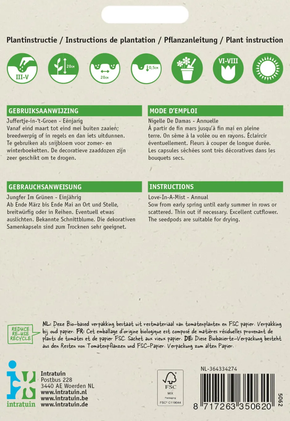 Die Aussaat erfolgt von April bis Ende Mai direkt in der Erde. Sollte es nach der Aussaat längere Zeit nicht regnen, solltest du den Boden mit einer Plastikfolie oder einem Vliestuch abdecken, um das Austrocknen des Bodens zu verhindern. Was den Boden anbelangt, ist jeder Boden recht. Allerdings bevorzugt die Jungfer im Grünen einen sonnigen Standort. Die Samen keimen innerhalb von 3 Wochen. Nach dem Keimen blüht die Jungfer im Grünen meist schon nach 5-6 Wochen. Die Blumen erreichen eine Höhe von 40-50 cm und Schmetterlinge und Bienen sind verrückt nach dem Nektar! Wenn du die runden Samenkapseln im Herbst und Winter stehen lässt, besteht die Chance, dass sich die Jungfer im Grünen spontan selbst aussäet und im nächsten Jahr wieder erblüht.