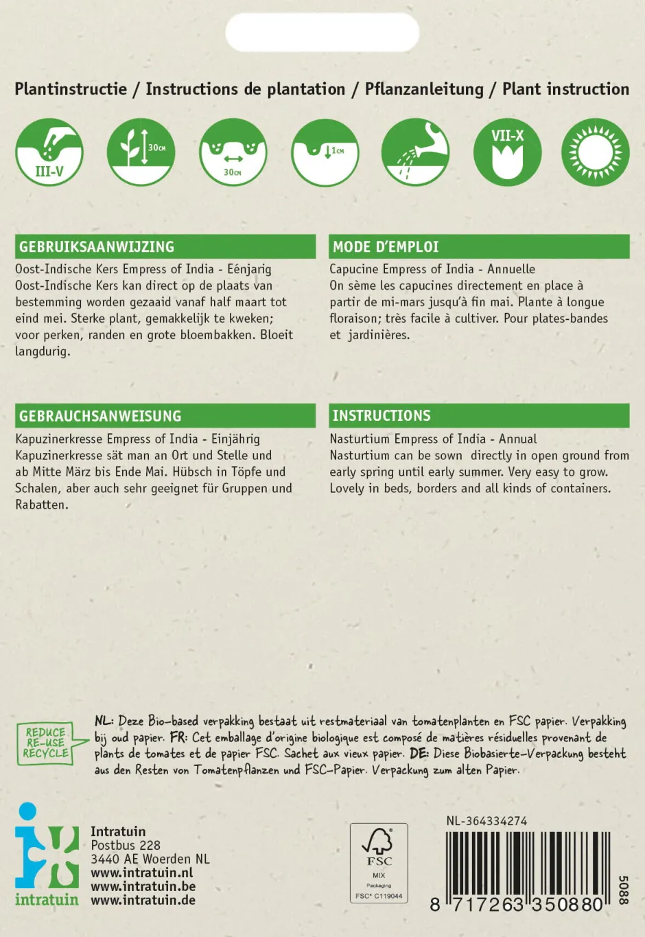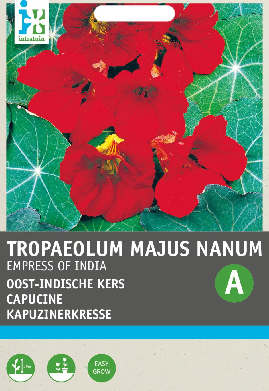 Die Kapuzinerkresse-Samen können im Haus ab Mitte März in einem Anzuchtkasten gesät werden. Ab Mitte Mai kann die Aussaat auch draußen erfolgen. Die Samen keimen einfach und die Pflanzen gedeihen sowohl im Blumentopf auf der Terrasse oder dem Balkon als auch im Garten. Für den Anbau der Kapuzinerkresse eignet sich jede Erde. Wähle einen Standort in der Sonne oder leichten Schatten. Wenn du die Samen der Kapuzinerkresse direkt am Bestimmungsort ausbringst, achte dann auf einen Pflanzabstand von 35 cm, denn die Kapuzinerkresse wächst zu recht großen Pflanzen heran. Die Blühte hält bis spät in den Herbst hinein an und auch leichten Nachtfrost verträgt die Kapuzinerkresse. Sowohl die runden Blätter als auch die farbintensiven Blüten sind essbar und schmecken leicht pfeffrig. Diese Sorte ‚Empress of India‘ ist nicht-rankend und bleibt von der Wuchsform her kompakter. Die Pflanzen bleiben mit einer Höhe von ca. 30 cm niedrig. Die Blüten dieser Kapuzinerkresse sind rot und bilden einen tollen Kontrast zu dem dunkelgrünen Blattwerk.