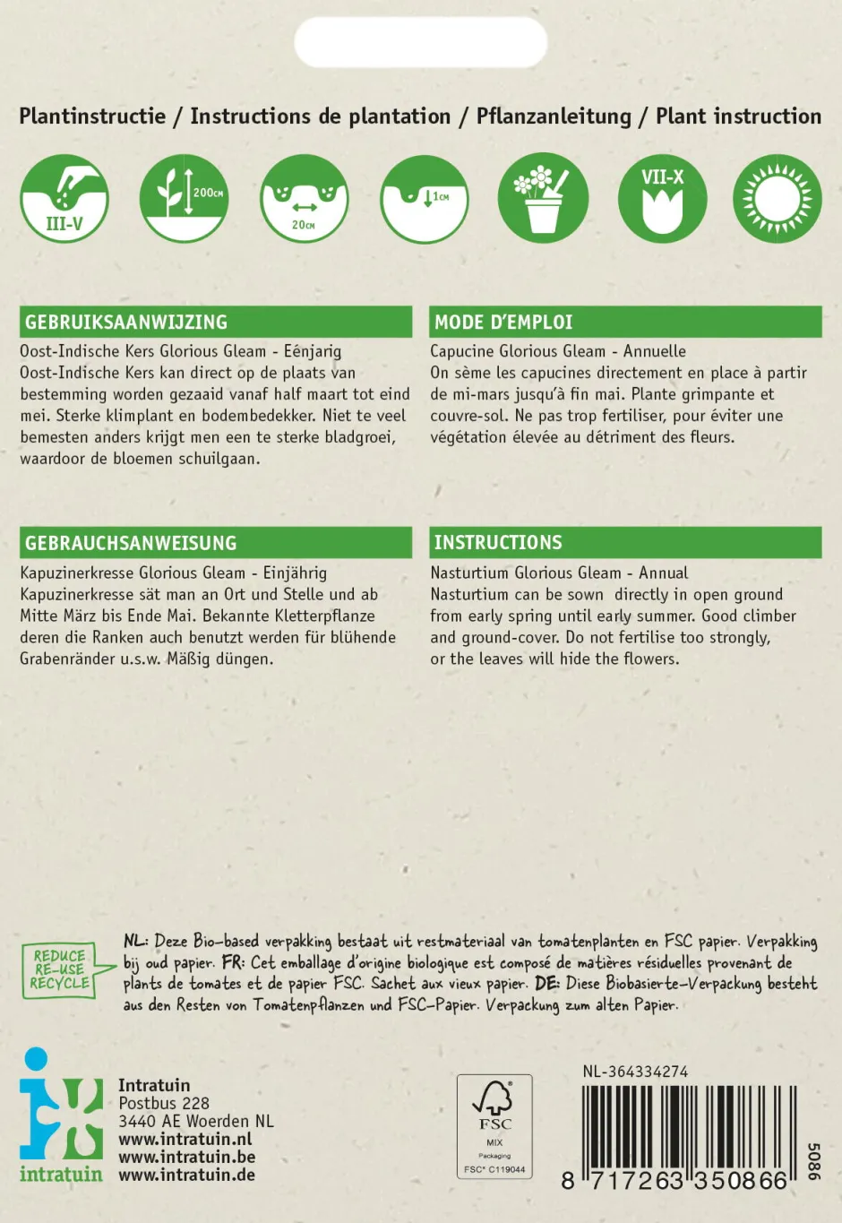 Die Kapuzinerkresse-Samen können im Haus ab Mitte März in einem Anzuchtkasten gesät werden. Ab Mitte Mai kann die Aussaat auch draußen erfolgen. Die Samen keimen einfach und die Pflanzen gedeihen sowohl im Blumentopf auf der Terrasse oder dem Balkon als auch im Garten. Für den Anbau der Kapuzinerkresse eignet sich jede Erde. Wähle einen Standort in der Sonne oder leichten Schatten. Wenn du die Samen der Kapuzinerkresse direkt am Bestimmungsort ausbringst, achte dann auf einen Pflanzabstand von 35 cm, denn die Kapuzinerkresse wächst zu recht großen Pflanzen heran. Die Blühte hält bis spät in den Herbst hinein an und auch leichten Nachtfrost verträgt die Kapuzinerkresse. Sowohl die runden Blätter als auch die farbintensiven Blüten sind essbar und schmecken leicht pfeffrig. Die Sorte ‚Glorious Gleam‘ hat eine doppelte Blütenhülle und ist eine Mischung unterschiedlicher Blütenfarben. Die Pflanzen bilden lange Ranken und können über den Boden kriechen oder an einem Zaun oder Gitter klettern. Dabei erreichen sie eine Höhe von ca. 150 cm.