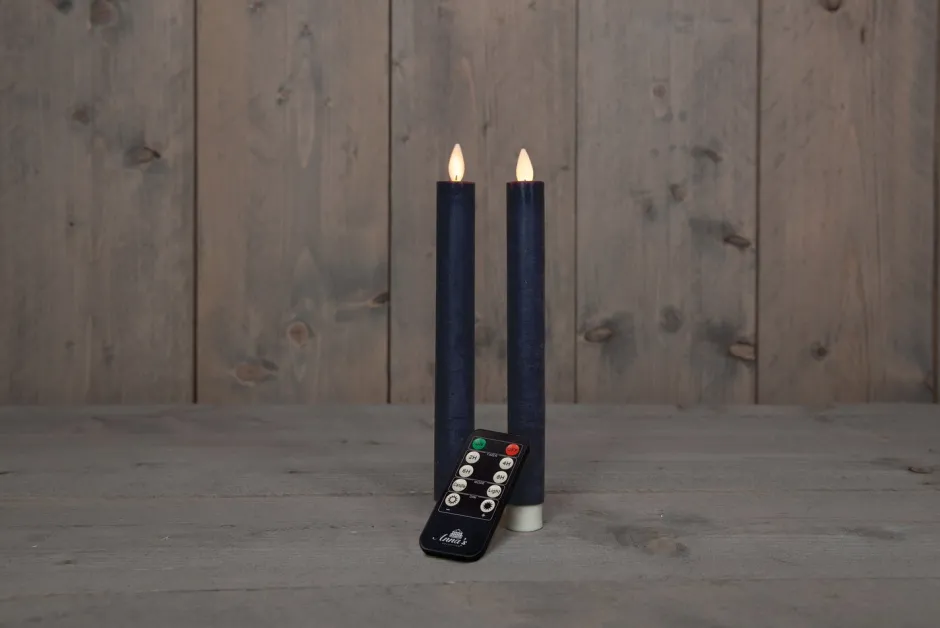 Diese 2 Stabkerzen haben LED-Lämpchen und lassen sich bequem mit der mitgelieferten Fernbedienung ein- und ausschalten. Die LED-Stabkerzen in der Farbe Blau sind batteriebetrieben, haben eine bewegliche Flamme und sind 23 cm lang. Erhältlich in verschi