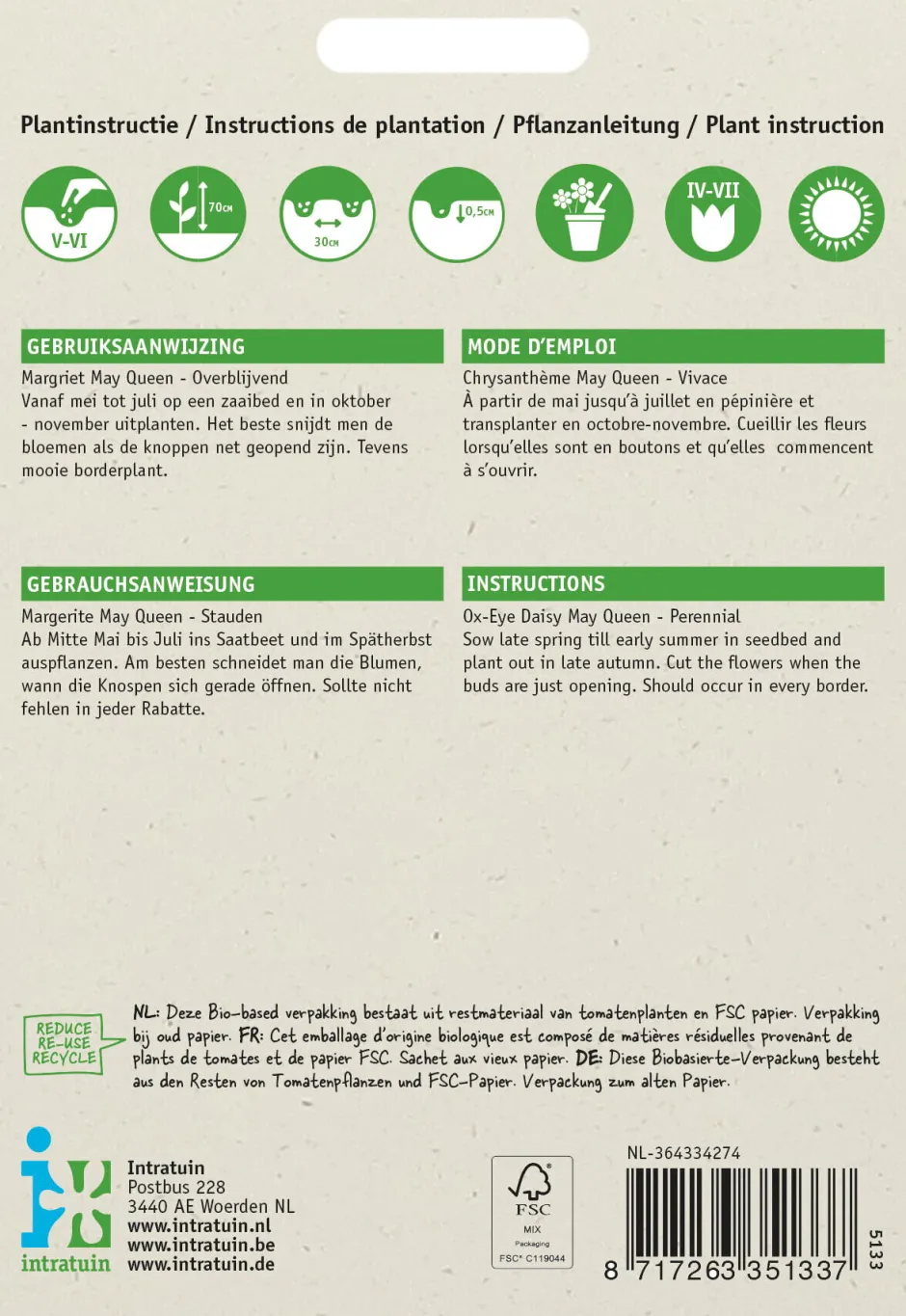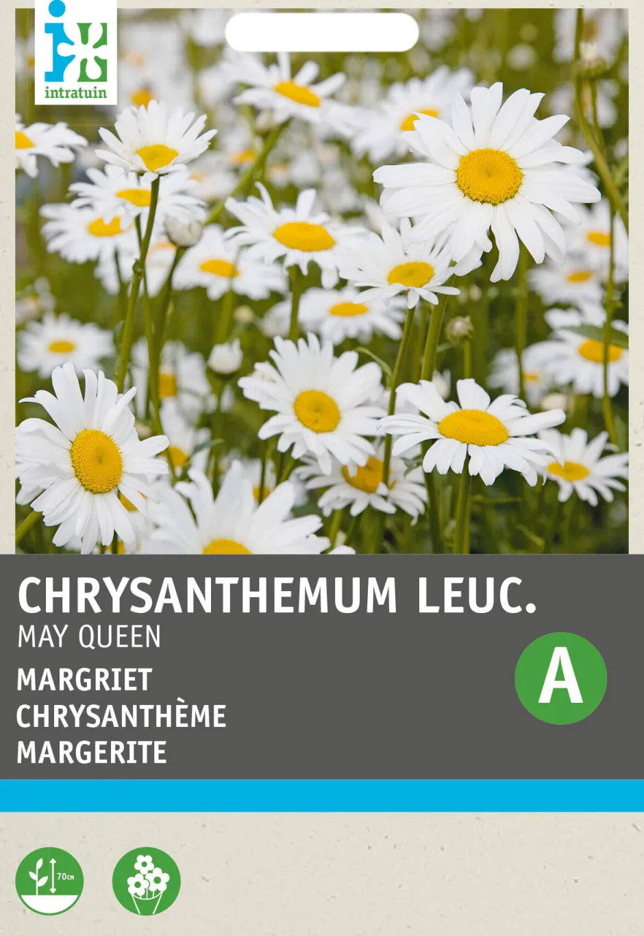 Diese Margerite mit dem schönen Namen ‚May Queen‘ kann von Mai bis Juli im Freien in ein Saatbeet gesät und im Oktober-November umgepflanzt werden. Diese Staude blüht dann ab dem folgenden Sommer. Wenn sie im März in einem Gewächshaus bei 10-16 Grad Celsius ausgesät werden, blühen diese Blumen bereits im ersten Jahr. Die Samen brauchen Licht, um zu keimen, also bedecke sie nur ganz leicht mit Aussaaterde. Die Pflanzen werden etwa 70 cm hoch und haben weiße Blüten mit einer gelben Mitte, die gerne von Bienen und Schmetterlingen besucht werden.