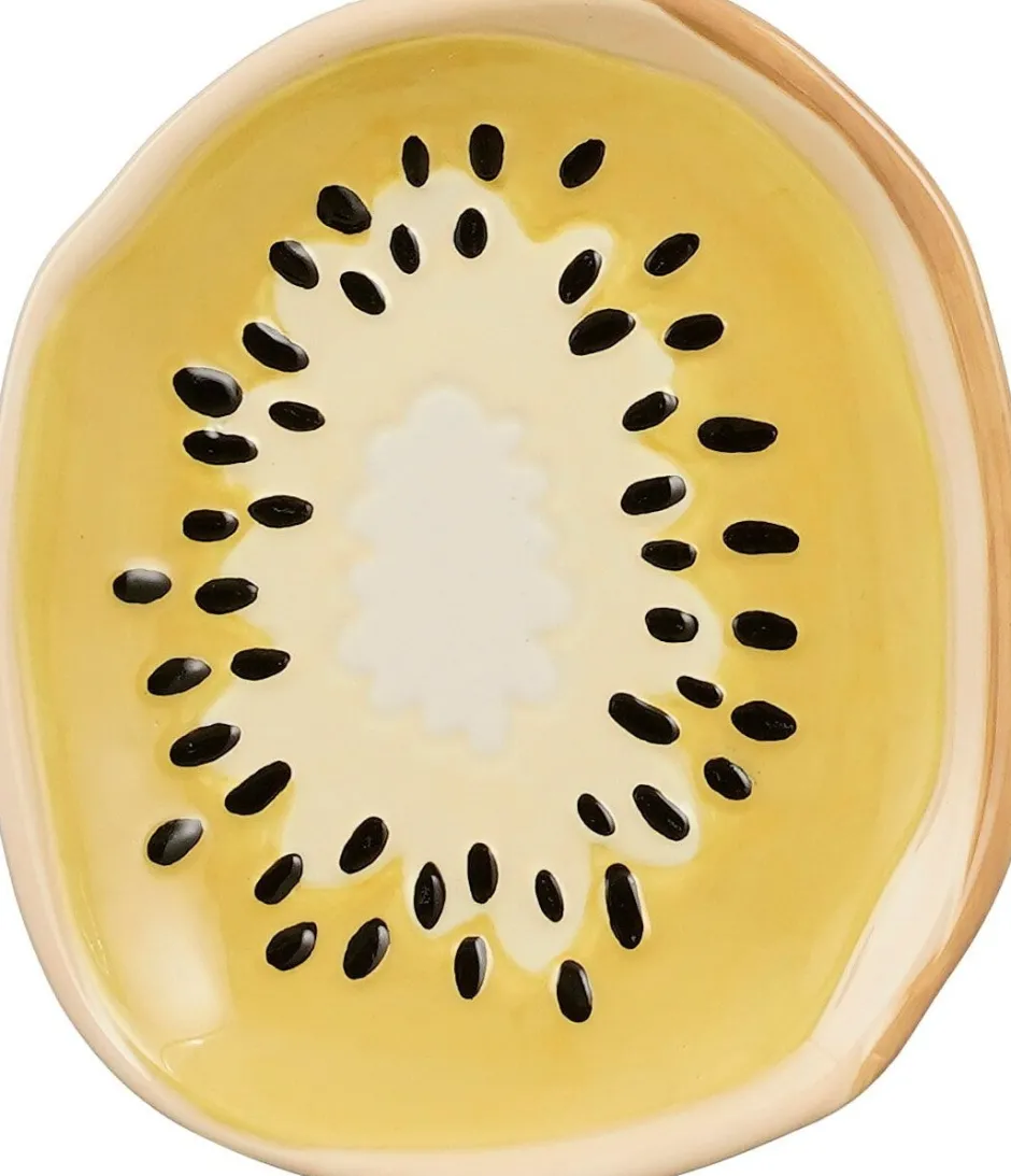 Bereichere deinen gedeckten Tisch mit dem Teller Exotica von Mica Decorations, einer exotischen Ergänzung deines Geschirrsets! Der Steingutteller hat die Form einer Kiwi und ist in einem frischen, hellen Grün gehalten. Er ist handgefertigt und sowohl für die Spülmaschine als auch für die Mikrowelle geeignet. Er lässt sich auch sehr gut mit anderem Exotica-Geschirr von Mica Decorations kombinieren! Die Maße dieses Tellers sind 15 x 12,5 x 2 cm.