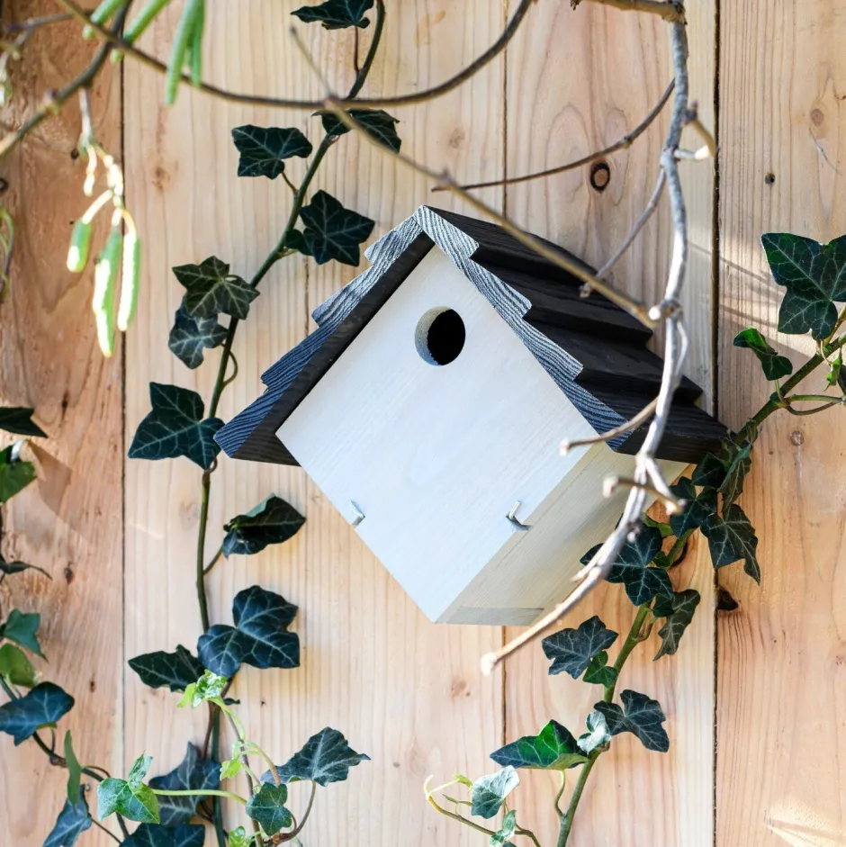 Dieser zweifarbige Nistkasten von Intratuin hat eine Eingangsöffnung von 32 mm Durchmesser und eignet sich daher für Feldsperling, Haussperling, Blaumeise, Kohlmeise und Tannenmeise. Das Kiefernholz wurde mit einer ungiftigen Holzlasur auf Wasserbasis behandelt. Die Vorderseite lässt sich zur Reinigung leicht öffnen. Hänge den Nistkasten einfach an einer Schraube oder einem Nagel auf. An der Rückseite befindet sich ein vorgebohrtes Loch.