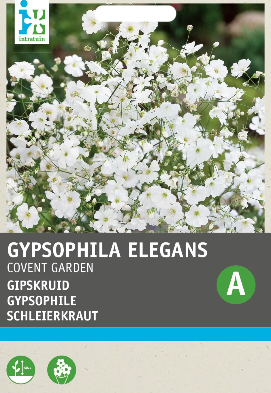 Gypsophila elegans ‚Covent Garden‘ ist eine Sorte, die im Vergleich zu anderem Schleierkraut relativ große Blüten hervorbringt. Die weißen Blüten wachsen wie Wolken schirmförmig an dünnen Stielen. Diese einjährige Pflanze erreicht eine Höhe von maximal 50 cm. Die graugrünen Blätter sind recht klein und unauffällig. Das Gipskraut mit seinen sternförmigen Blüten gehört zur Familie der Nelkengewächse und gedeiht auch auf steinigen Böden.