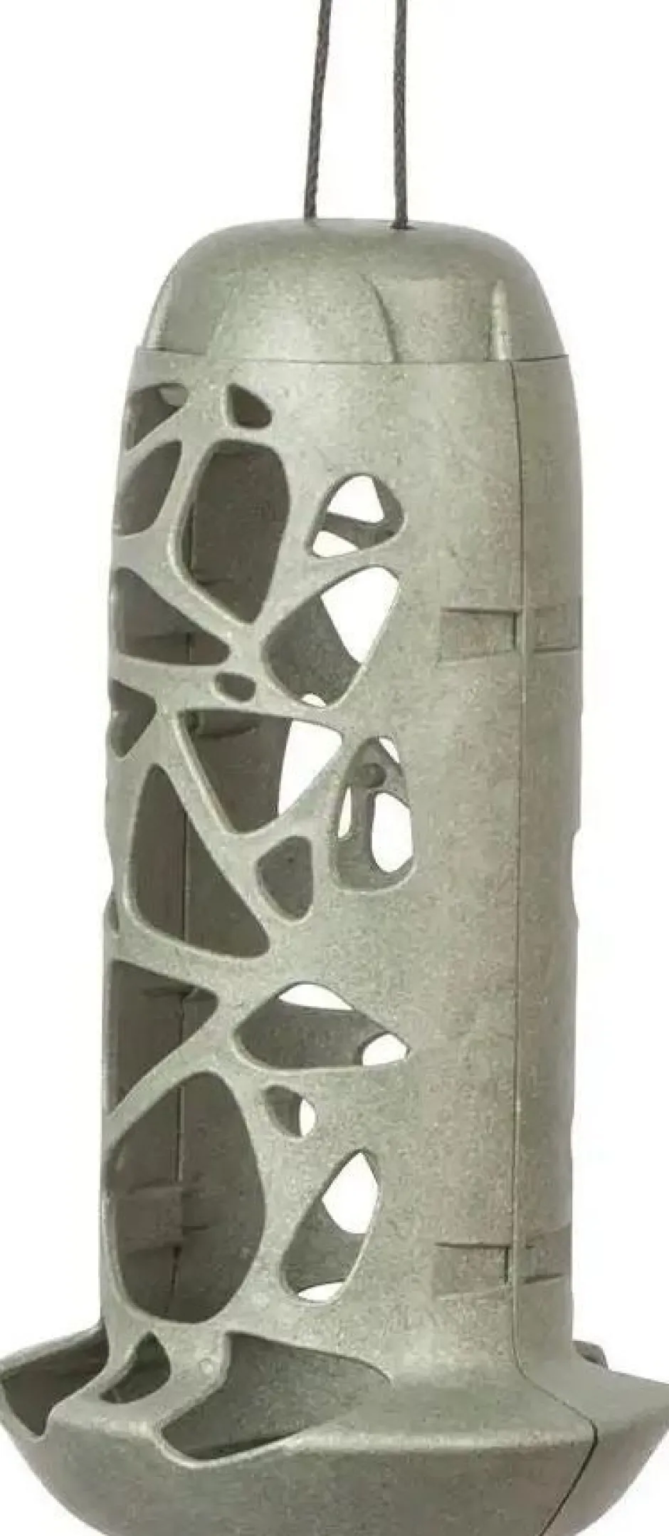 Der Meisenknödelhalter Tara ist grau und besteht zu 100 % aus recyceltem Material – nämlich aus dem Inneren von Getränkebehältern. Es hat einen Durchmesser von 13 cm, bei einer Länge von 25 cm.