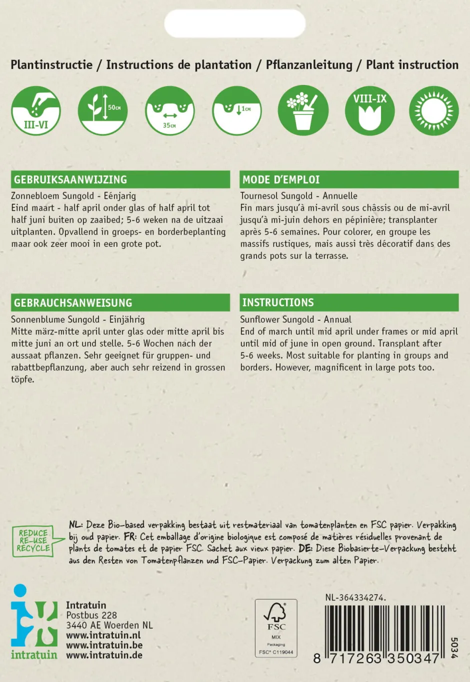Diese Sonnenblumen-Sorte Heliathus annus ‚Sungold‘ ist doppelblütig und wird 120-180 cm hoch. Sowohl die kurzen Blütenblätter als auch das Herz der Blüte sind gelb. Die Sonnenblumensamen werden Ende März bis Mitte April in Anzuchttöpfen oder einem Anzuchtkasten ausgesät werden. Ab Mitte April bis Mitte Juni kannst du die Samen auch draußen in einem Saatbeet oder direkt am Bestimmungsort ausbringen. Am besten keimen die Sonnenblumensamen bei einer Temperatur von 15-25° C. Bedecke die Samen mit 2 cm Erde und einer Plastikfolie, damit sie nicht von Mäusen oder Vögeln gefressen werden. Die jungen Sonnenblumenpflanzen wachsen schnell, so dass man sie bereits 5-6 Wochen nach der Aussaat mit einem großzügigen Pflanzabstand auspflanzen kann. Deze zonnebloemen bloeien in augustus-oktober und staan graag op een zonnige plaats. Zet deze hoge planten achterin de border of combineer ze met siergrassen und hoog groeiende vaste planten.
