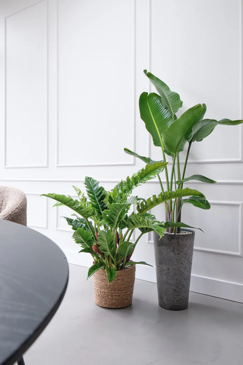 Bei der Strelitzie handelt es sich um eine stammlose Pflanze mit langen Blättern (30-40 cm), die an der Unterseite schmal sind und oben ein breites Blatt ausbilden. Im Sommer kann die Strelitzie auch prima ins Freie auf die Terrasse, wo sie Urlaubsfeeling pur versprüht! Es gibt zwei bekannte Strelitzien-Arten: Strelitzia nicolai und Strelitzia reginae, wobei die Strelitzia reginae schönere, farbintensivere Blüten bildet. Sie ist daher auch als Paradiesvogelblume bekannt. Das Blatt der Strelitzia nicolai hingegen ist runder und hat eine gleichmäßigere Farbe, als Zimmerpflanze aber blüht die sie hierzulande nur höchst selten.