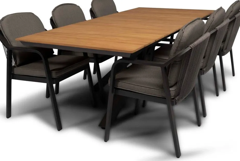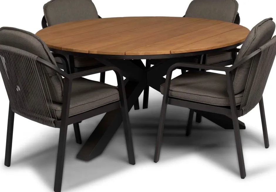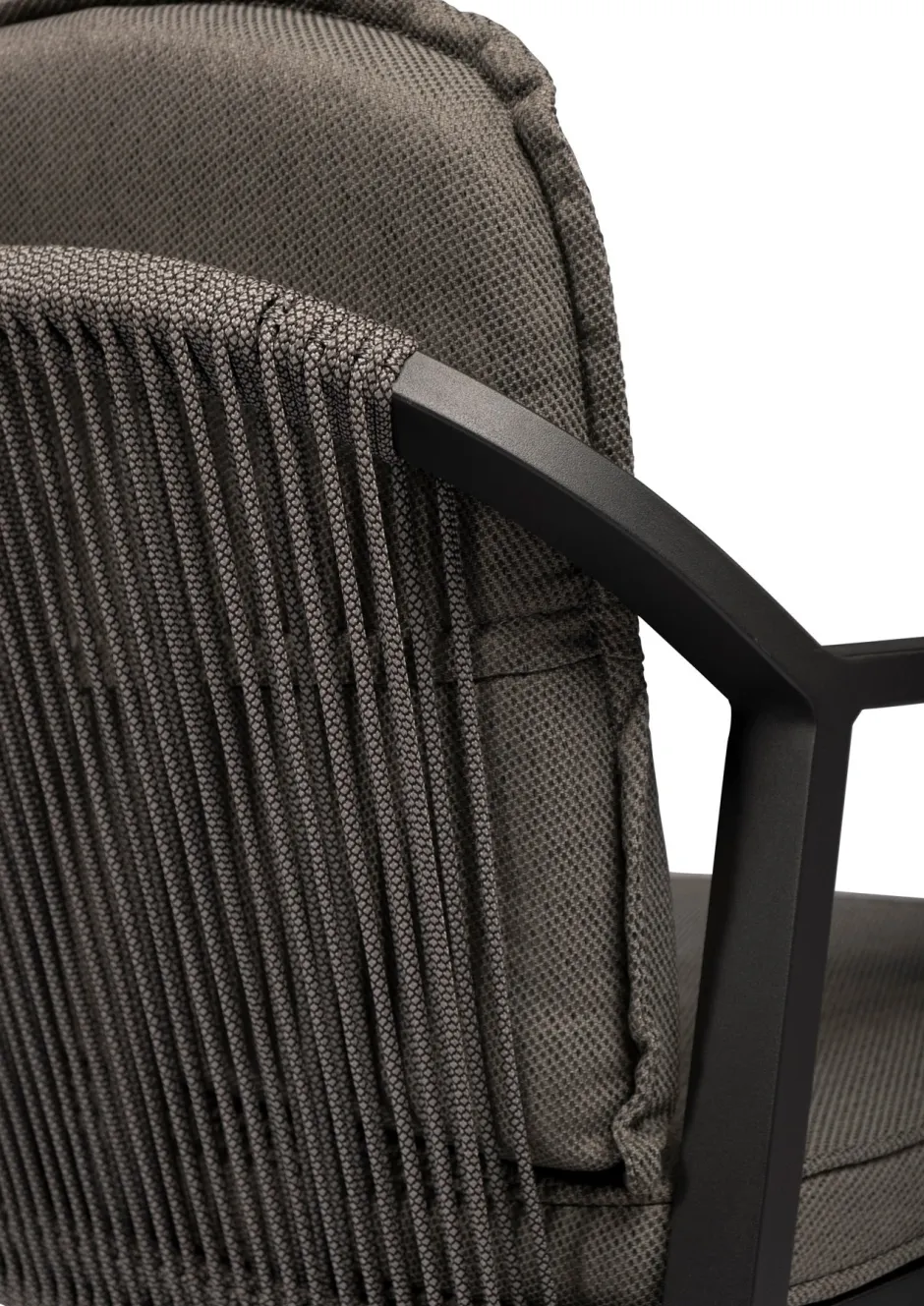 Der Gartenstuhl ‚Pep‘ der Marke Tierra Outdoor ist mit seinem modernen und zeitlosen Design ein echter Zugewinn für deine Terrasse. Die abgerundeten Ecken verleihen dem Gartenstuhl ‚Pep‘ einen spielerischen Twist. Der Dining-Gartenstuhl besteht aus einem beschichteten Aluminium-Gestell in der Farbe Charcoal (anthrazit) und einer mit Olefin-Seil bespannten Sitzfläche, die diesen Stuhl zu einem wahrne Hingucker macht. Dieses Seil ist speziell für den Einsatz im Freien entwickelt und wird aus besonders strapazierfähigen synthetischen Fasern gefertigt. So ist die Seilbespannung nicht nur äußerst robust und komfortabel, sondern sieht auch nur sehr dekorativ aus. Kein Wunder also, dass seilbespannte Gartenmöbel voll im Trend sind und derzeit die Gärten erobern! Die hochwertigen „Allwetter“-Kissen in der Farbe grau sind ebenfalls im Lieferumfang enthalten. Das Sitz- und Rückenkissen ist extra gepolstert und sorgt so für optimalen Sitzkomfort. Die Kissen können problemlos bei einem leichten Regenschauer draußen bleiben und erleichtern dir so das Leben!