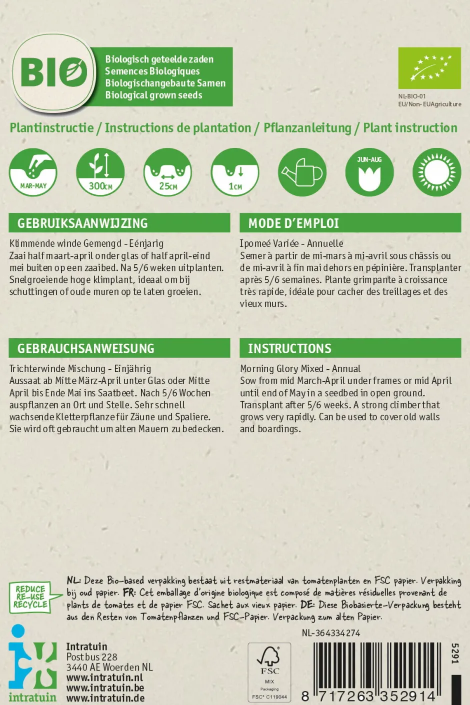 Die Trichterwinde ist eine einjährige Kletterpflanze, die schnell wächst und üppig blüht. Diese Mischung enthält Samen für Pflanzen mit verschiedenfarbigen Blüten in Lila-Tönen. Die Blüten sind recht groß und haben die Form einer Untertasse oder eines Trichters. Das Herz der Blumen ist weiß. Sie eignen sich für einen sonnigen Platz im Garten an einer Kletterhilfe, aber sie machen sich auch gut in einem Pflanzgefäß oder Blumentopf. Wenn du die verwelkten Blüten regelmäßig entfernst, bilden sich keine Samen und die Pflanzen blühen länger.