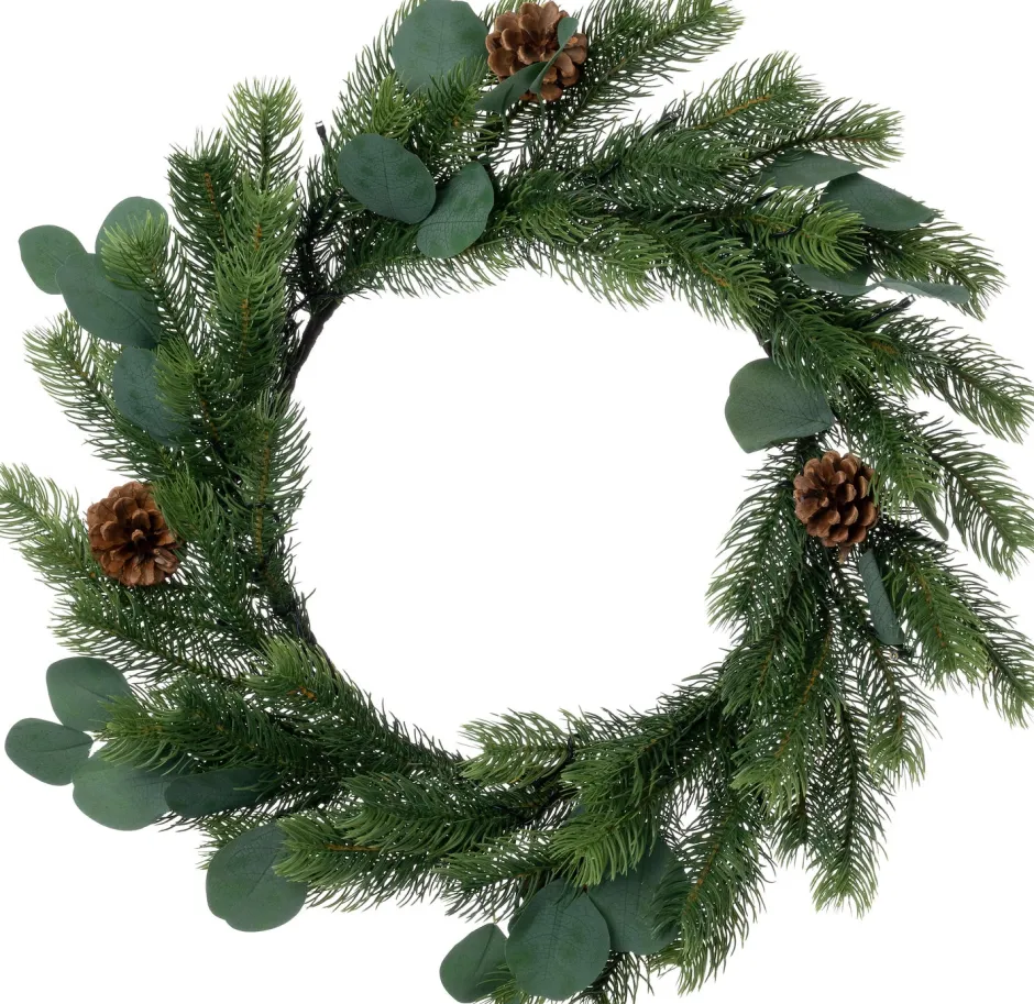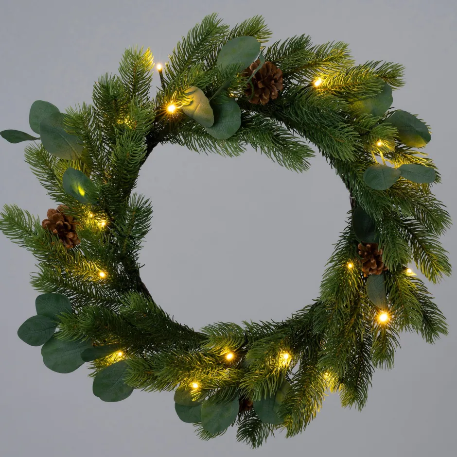 Setze ein festliches Highlight in deinem Zuhause mit diesem stilvollen Weihnachtskranz von Intratuin. Der Kranz hat einen Durchmesser von 45 cm und eine Höhe von 10 cm und ist wunderschön mit natürlichen Tannenzapfen geschmückt, die ihm einen warmen, rustikalen Charme verleihen. Die 30 warmweißen Lichter erzeugen ein sanftes, gemütliches Leuchten, das perfekt zur Weihnachtsstimmung passt. Dank des kompakten Formats ist der Kranz vielseitig einsetzbar: Hänge ihn an die Tür, über den Kamin oder lege ihn als Tischdekoration auf. Die Beleuchtung funktioniert mit Batterien (nicht im Lieferumfang enthalten), sodass du dich nicht um Steckdosen oder Kabel kümmern musst. Dieser Weihnachtskranz vereint natürlichen Charme mit praktischem Nutzen und sorgt garantiert für eine warme, einladende Atmosphäre während der Feiertage.