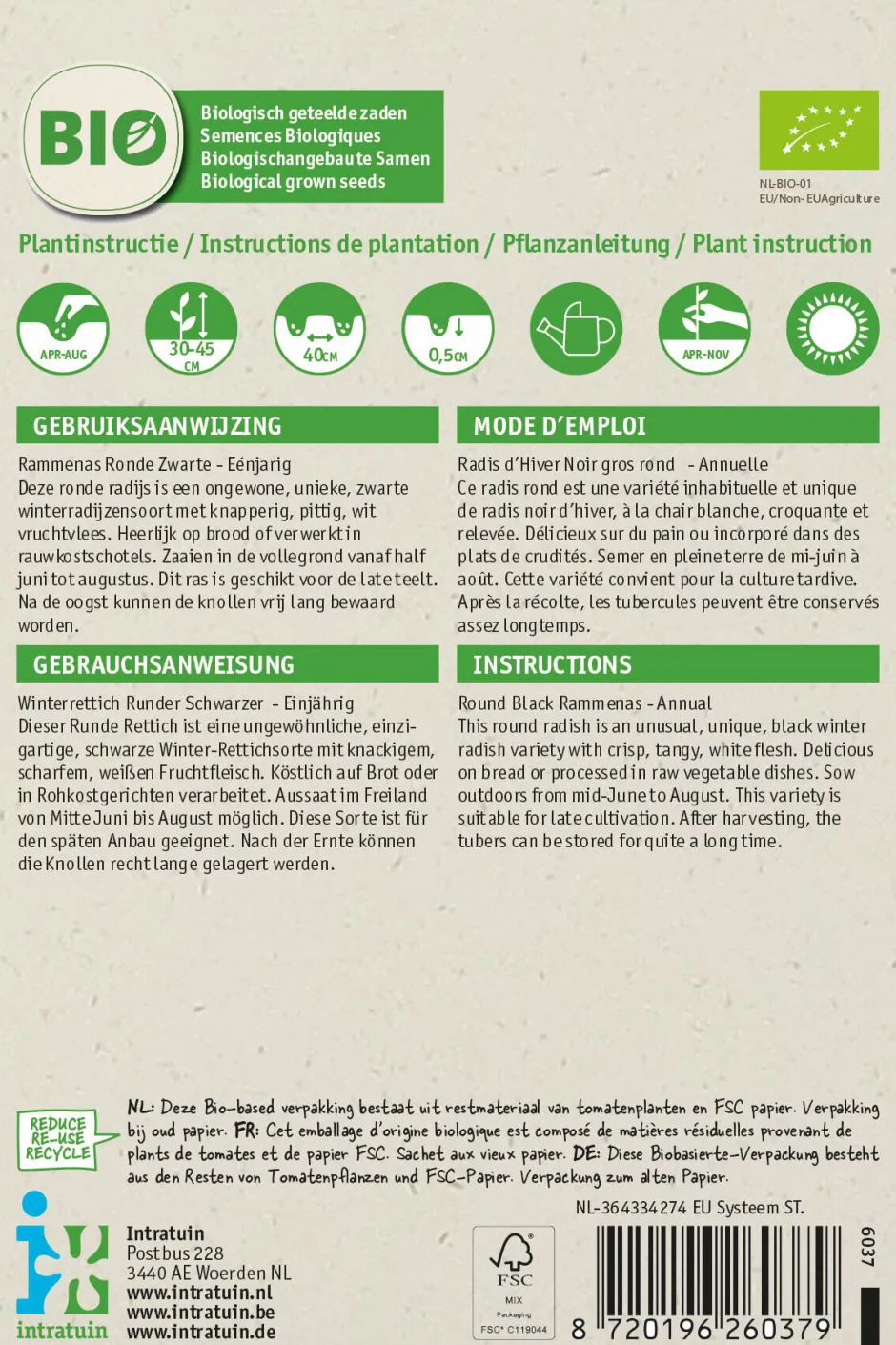 Der Winterrettich bildet schwarze Wurzeln mit schmackhaftem weißem Fleisch. Er wird von Mitte Juni bis Mitte August in Reihen von 20 x 5 cm Abstand direkt in den Garten gesät. Nicht zu früh aussäen, denn dann bilden sich leicht Blütenstängel, das so genannte Verblühen. Lockere den Boden zunächst gut auf und mische die schwere Erde mit grobem Sand oder kultiviere in Hochbeeten. Die besten Ergebnisse werden auf leichteren, lockeren Böden erzielt. Schlechte Böden können mit Kompost oder Kuhmistpellets verbessert werden.