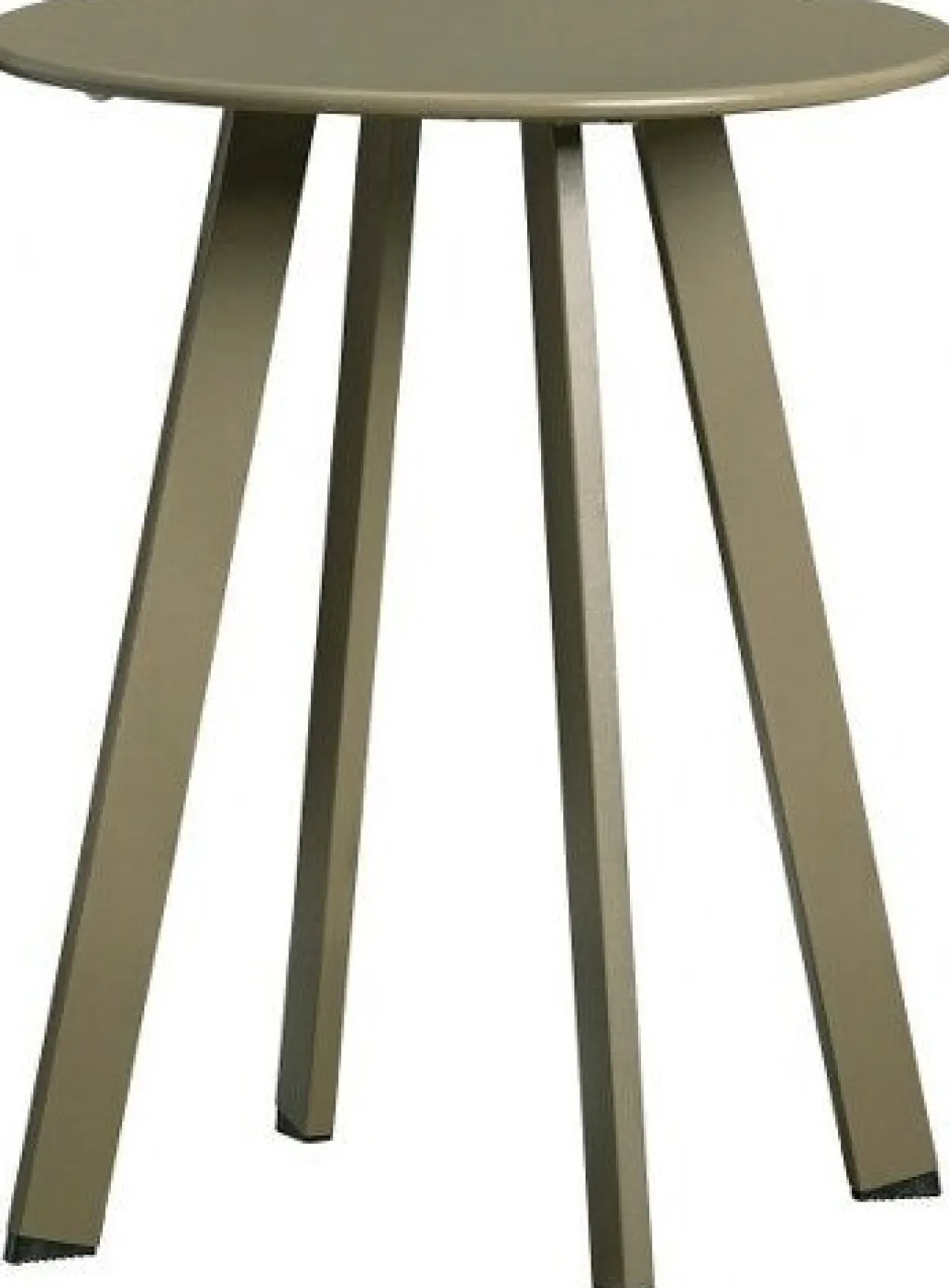 Der Tisch hat eine runde Oberfläche und ausgestellte Beine. Fer ist in verschiedenen Farben erhältlich. Der Durchmesser dieses grünen Modells beträgt 40 cm bei einer Höhe von 49 cm. Der Beistelltisch ist sowohl für den Innen- als auch für den Außenbereich geeignet. Es wird jedoch empfohlen, dieses Möbel, wenn möglich, im Winter im Haus unter zu stellen. Außerdem ist es durch seine wasserdichte Beschichtung wetterfest.