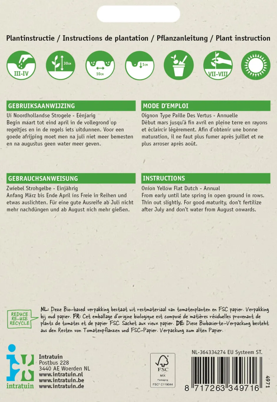 Die Samen der Zwiebel-Sorte ‚Strohgelbe‘ werden von März bis Mai im Freien in Reihen gesät. Na opkomst kunnen ze worden uitgedund tot een onderlinge afstand van 25 x 10 cm. Nach dem Keimen sollten die jungen Zwiebelpflanzen ausgedünnt werden, sodass sie mit einem Pflanzabstand von ca. 25 x 10 cm gedeihen können. Säe die Zwiebelsamen in gut gedüngte Erde, aber dünge nach der Aussaat nicht mehr, damit die Speisezwiebeln im Sommer gut reifen können. Nach August sollen die Zwiebeln trocknen, gieße dann also nicht mehr. Die Zwiebeln können geerntet werden, wenn die Blätter gelb geworden sind und umfallen. Dies geschieht je nach Aussaat von August bis Oktober. Lasse die Zwiebeln gut trocknen und lagere sie an einem kühlen Ort. Diese Zwiebelsorte bringt platt geformte, große Zwiebeln hervor, die sich gut lagern lassen. Der Geschmack der Zwiebeln ist lecker scharf.